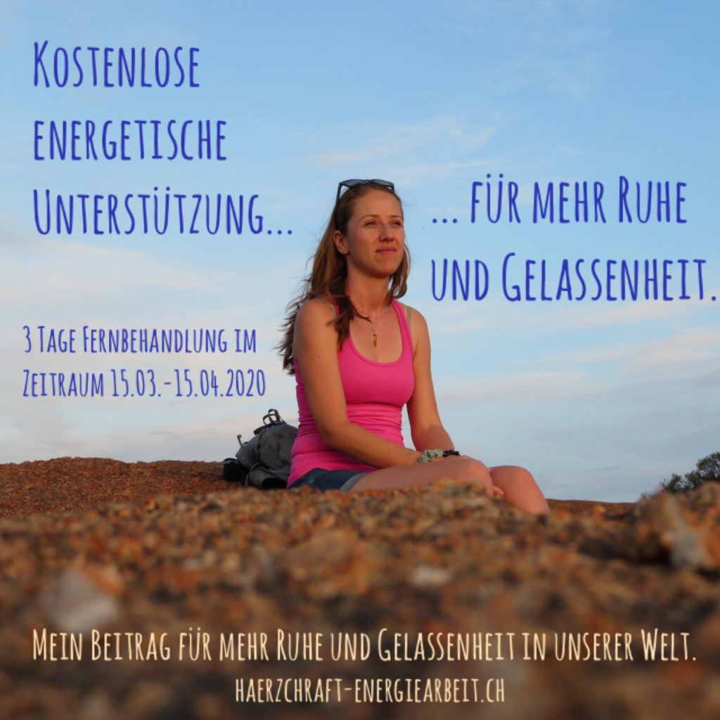 Kostenlos während 3 Tagen – für mehr Ruhe und Gelassenheit noch bis am 15. April 2020. Schreib mir einfach eine Nachricht oder ruf mich an (haerzchraft@bluewin.ch / +41 (0) 79 483 04 38).